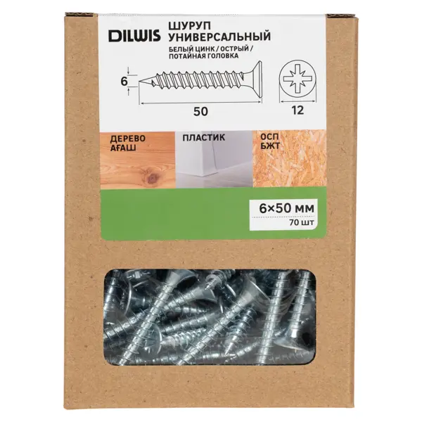 Саморезы универсальные DILWIS потайные острые оцинкованные 6x50 мм 70 шт.