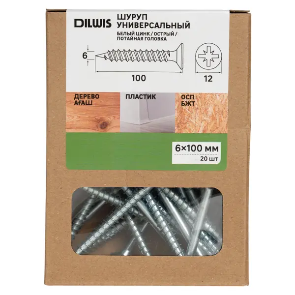 Саморезы универсальные DILWIS потайные острые оцинкованные 6x100 мм 20 шт.