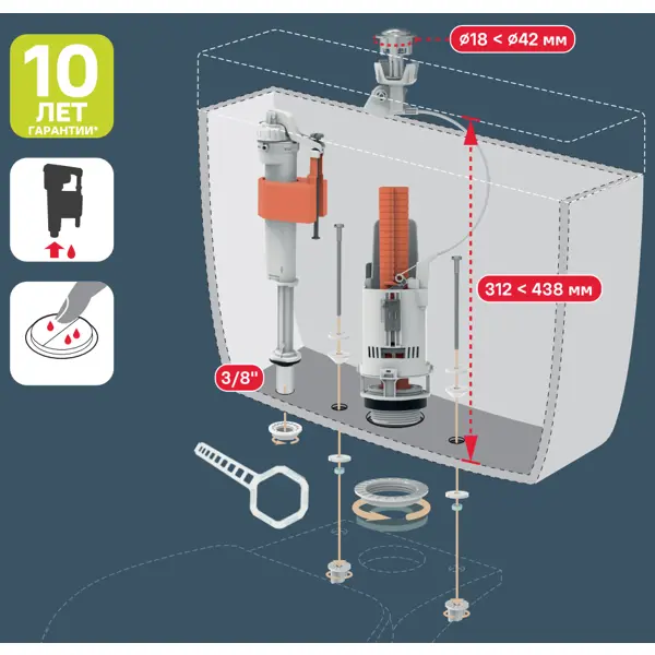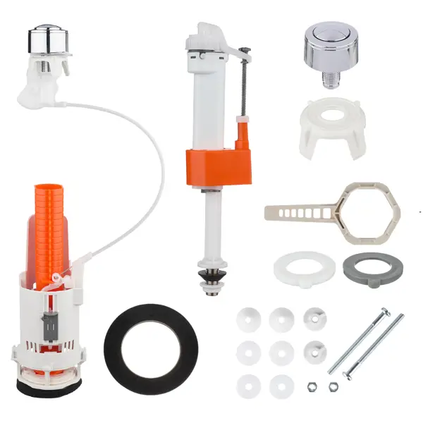 Выпускной клапан BRIO 575, наполнительный клапан 754 3/8 латунь нижний подвод, нажимная кнопка двухрежимная прокладка м/у бачком и унитазом 108*68*15 ,монтажный ключ универсальный, комплект наклонных прокладок 3/8 набор крепежей бачка к унитазу 78 мм, Ин