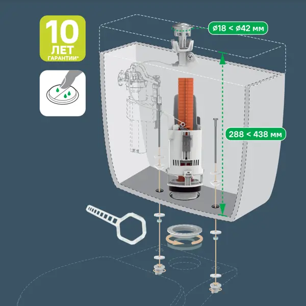 **Сливной клапан Monlid двухрежимный c тросовым механизмом.** Регулируемый объем большого и малого спуска воды. Большой спуск регулируется с 6л до 4л, малый спуск регулируется с 3л. до 2л. Двухрежимная хомированная кнопка устойчива к истиранию. Седло (или донный клапан) изготовлено из прочного пластика ABS. Прокладка между спускным клапаном и дном бачка выполнена из литого эластомера СБС. Её эластичность и форма усиливают герметичность донной части бачка. Прокладка между бачком и унитазом изготовлена из пенорезины, позволяет компенсировать неровности полки унитаза. Испытан и сертифицирован более чем на 200 000 циклов.Клапан подходит для бачков различной высоты: от 288 мм до 438 мм. с допустимым диаметром отверстия в крышке бачка от 18 до 42 мм и возможностью установки дополнительного опорного кольца при необходимости. ### Комплектация: - клапан спускной с тросовым механизмом - кнопка двухрежимная с опорным