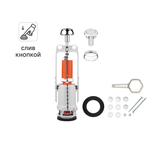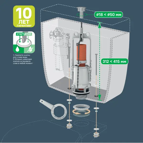 **Сливной механизм Monlid с функцией "Старт-стоп" и хромированной кнопкой** - это приспособление для слива воды в унитазе. Клапан подходит для бачков различной высоты: от 321 мм до 415 мм. с допустимым диаметром отверстия в крышке бачка от 18 до 50 мм и возможностью установки дополнительного опорного кольца при необходимости. Однорежимная хромированная кнопка устойчива к истиранию. Клапан оснащен функцией "старт-стоп", что позволяет пользователю экономить воду. Чтобы воспользоваться опцией пользователю нужно нажать кнопку в процессе слива повторно для его остановки. Седло изготовлено из пластика ABS, что обеспечивает мощный поток воды при смыве (не менее 2,5 л/с). Плоский клапан эластичен обеспечивает долгий срок службы и герметичность. Прокладка между бачком и унитазом изготовлена из пенорезины для компенсации неровности полки унитаза Минимальное время работы - 200.000 циклов в нормальных условиях эксплуатации. ### Комплектация: