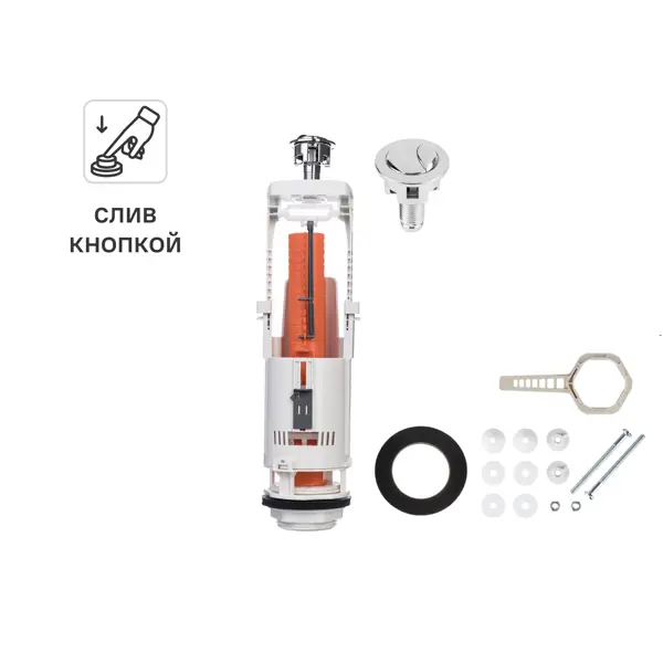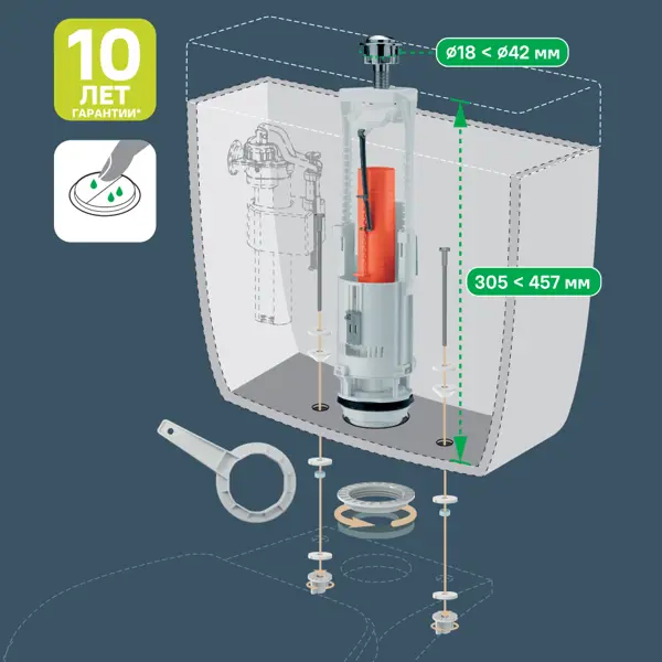**Сливной клапан Monlid с двойным кнопочным пуском.** Регулируемый объем большого и малого спуска воды. Большой спуск регулируется с 6л до 4л, малый спуск регулируется с 3л. до 2л. Двухрежимная хомированная кнопка устойчива к истиранию. Испытан и сертифицирован более чем на 200 000 циклов. Седло (или донный клапан) изготовлено из прочного пластика ABS. Прокладка между спускным клапаном и дном бачка выполнена из литого эластомера СБС. Её эластичность и форма усиливают герметичность донной части бачка. Прокладка между бачком и унитазом изготовлена из пенорезины, позволяет компенсировать неровности полки унитаза. Клапан подходит для бачков различной высоты: от 305 до 457мм с допустимым диаметром отверстия в крышке бачка от 18 до 42мм ### Комплектация: - клапан спускной - кнопка двухрежимная - монтажный комплект **БЕРЕЖНО К ЛЮДЯМ, БЕРЕЖНО