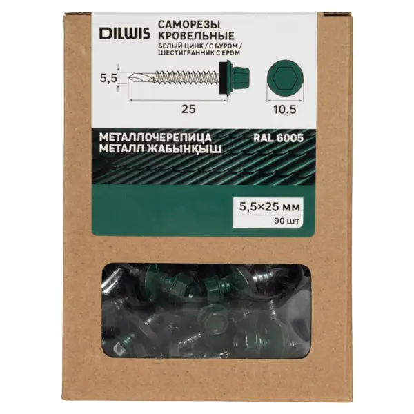 Саморезы кровельные по металлу DILWIS с пресс-шайбой со сверлом 5.5x25 мм RAL 6005 90 шт.