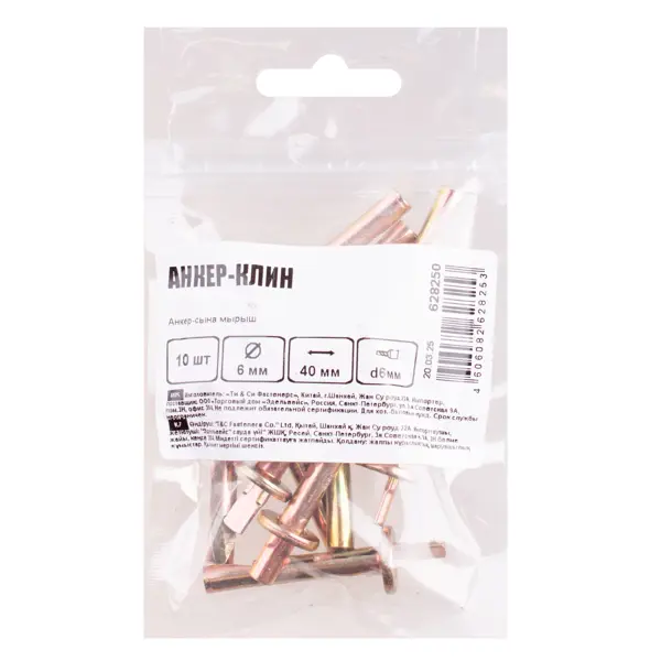 **Анкер-клин Топ500** — это крепежный элемент, предназначенный для создания высокопрочного крепления в твердых строительных материалах. Конструкция включает три основных компонента: металлическую со специальным срезом, клиновидный распор в виде стержня, сужающегося к концу, стопорную головку (плоскую шайбу) для предотвращения чрезмерного углубления. Предназначен для монтажа подвесных потолков из легких материалов, установки вентиляционных каналов и решеток, крепления кабельных линий, монтажа тонких металлических реек, уголков и профилей, . ### Особенности: - для монтажа необходимо сверлить отверстие точно по диаметру анкера, глубина сверления должна превышать длину изделия; - отличается высокой несущей способностью, устойчивостью к термическим воздействиям; - не рекомендуется использовать для крепления тяжелых конструкций, а также в пористых и мягких материалах; - демонтаж после установки невозможен; - размеры: 6 x 40 мм; - в упаковке находится 10 шт.