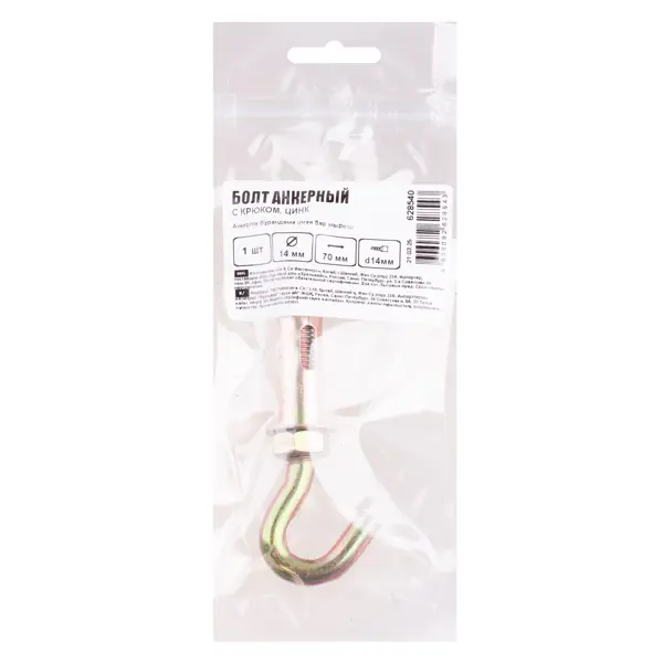**Анкер с крюком** — это крепежное изделие, состоящее из металлической втулки, болта и конусной гайки. Установка производится путем сквозного монтажа в предварительно просверленное отверстие как в прикрепляемом материале, так и в основании. Конструкция включает три основных элемента: металлическую втулку, болт, конусную гайку. Основное назначение данного крепежного элемента: крепление стальных конструкций, установка решеток, монтаж перил, установка консолей, крепление лестниц, монтаж ворот, работы с бетоном, работы с природным камнем плотной структуры. ### Особенности: - надежное крепление обеспечивается за счет силы трения между втулкой и материалом основания; - существует возможность демонтажа анкера при необходимости; - отличается устойчивостью к коррозии за счет цинкового покрытия; - размеры: 14 x 70 мм.