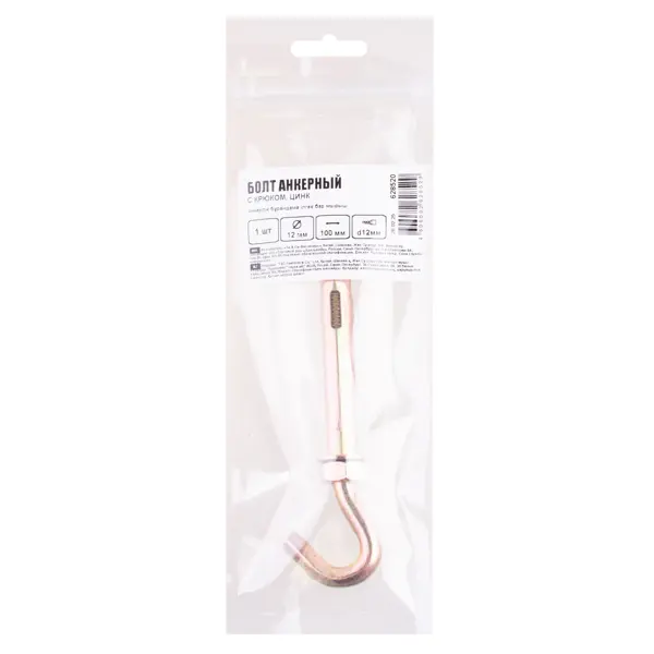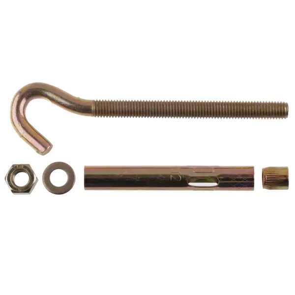 **Анкер с крюком** — это крепежное изделие, состоящее из металлической втулки, болта и конусной гайки. Установка производится путем сквозного монтажа в предварительно просверленное отверстие как в прикрепляемом материале, так и в основании. Конструкция включает три основных элемента: металлическую втулку, болт, конусную гайку. Основное назначение данного крепежного элемента: крепление стальных конструкций, установка решеток, монтаж перил, установка консолей, крепление лестниц, монтаж ворот, работы с бетоном, работы с природным камнем плотной структуры. ### Особенности: - надежное крепление обеспечивается за счет силы трения между втулкой и материалом основания; - существует возможность демонтажа анкера при необходимости; - отличается устойчивостью к коррозии за счет цинкового покрытия; - размеры: 12 x 100 мм.