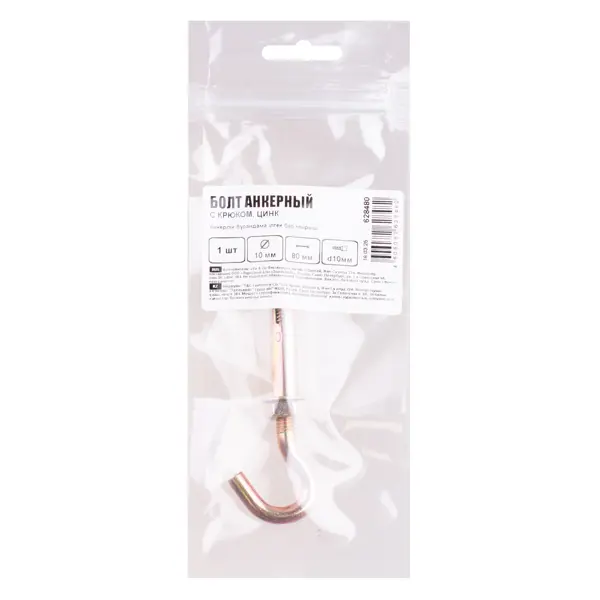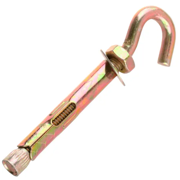 **Анкер с крюком** — это крепежное изделие, состоящее из металлической втулки, болта и конусной гайки. Установка производится путем сквозного монтажа в предварительно просверленное отверстие как в прикрепляемом материале, так и в основании. Конструкция включает три основных элемента: металлическую втулку, болт, конусную гайку. Основное назначение данного крепежного элемента: крепление стальных конструкций, установка решеток, монтаж перил, установка консолей, крепление лестниц, монтаж ворот, работы с бетоном, работы с природным камнем плотной структуры. ### Особенности: - надежное крепление обеспечивается за счет силы трения между втулкой и материалом основания; - существует возможность демонтажа анкера при необходимости; - отличается устойчивостью к коррозии за счет цинкового покрытия; - размеры: 10 x 80 мм.