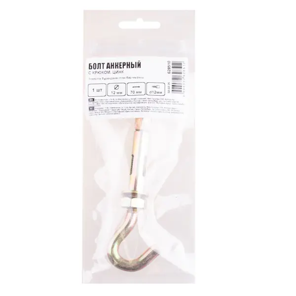 **Анкер с крюком** — это крепежное изделие, состоящее из металлической втулки, болта и конусной гайки. Установка производится путем сквозного монтажа в предварительно просверленное отверстие как в прикрепляемом материале, так и в основании. Конструкция включает три основных элемента: металлическую втулку, болт, конусную гайку. Основное назначение данного крепежного элемента: крепление стальных конструкций, установка решеток, монтаж перил, установка консолей, крепление лестниц, монтаж ворот, работы с бетоном, работы с природным камнем плотной структуры. ### Особенности: - надежное крепление обеспечивается за счет силы трения между втулкой и материалом основания; - существует возможность демонтажа анкера при необходимости; - отличается устойчивостью к коррозии за счет цинкового покрытия; - размеры: 12 x 70 мм.
