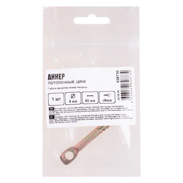 **Анкер потолочный** — это крепежное изделие, предназначенное для монтажа различных подвесных конструкций, таких как тросы, цепи, кабели, светильники и подвесные потолки, в основания из бетона, камня или полнотелого кирпича. Перед началом монтажа необходимо высверлить отверстие в основании по размерам анкера. Крепеж помещается в подготовленное монтажное гнездо. Анкер забивается до упора ударом молотка. Фиксация анкера в отверстии осуществляется путем вращения его вокруг своей оси. ### Особенности: - изготовлен из прочного стального сплава и покрыт цинковым слоем для защиты от коррозии; - представляет собой стальной стержень с конусообразным клином и распорным кольцом с ассиметрично расположенными зубьями, которые обеспечивают надежную фиксацию в твердых основаниях; - на головке анкера предусмотрено ушко с отверстием для монтажа подвесных конструкций; - обеспечивает прочное и надежное крепление подвесных конструкций; - легко устанавливается и не требует сложного оборудования; - цинково