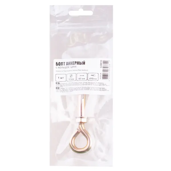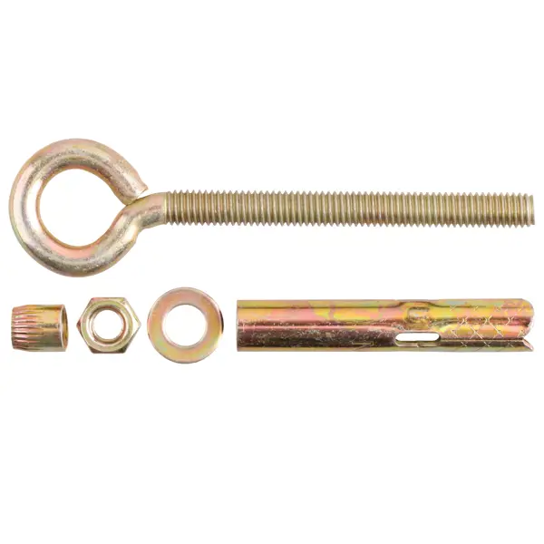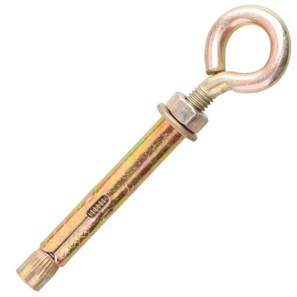 **Анкер с кольцом** — это крепежный элемент, предназначенный для монтажа тяжелых подвесных конструкций и установки растяжек. Конструкция анкерного болта включает шпильку с изогнутым кольцом на одном конце, стальную оболочку с сечениями, конусовидную цангу с внутренней резьбой. Принцип работы: при затягивании шпильки цанга распирает оболочку, обеспечивая надежное крепление в основании. Анкер предназначен для монтажа тяжелых подвесных конструкций, установки растяжек, крепления тросов, цепей, канатов и веревок, монтажа различного такелажа. ### Особенности: - подходит для монтажа в бетон; - можно использовать для крепежа конструкций в полнотелый кирпич; - допускается установка в камень; - обеспечивает надежное крепление благодаря распорной конструкции; - защитное цинковое покрытие предотвращает коррозию; - размеры: 10 x 60 мм.