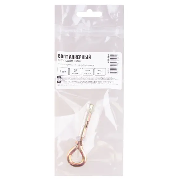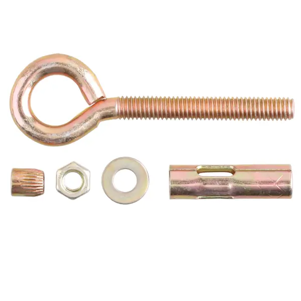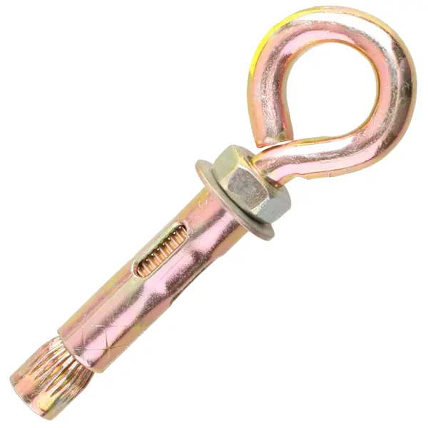 **Анкер с кольцом** — это крепежный элемент, предназначенный для монтажа тяжелых подвесных конструкций и установки растяжек. Конструкция анкерного болта включает шпильку с изогнутым кольцом на одном конце, стальную оболочку с сечениями, конусовидную цангу с внутренней резьбой. Принцип работы: при затягивании шпильки цанга распирает оболочку, обеспечивая надежное крепление в основании. Анкер предназначен для монтажа тяжелых подвесных конструкций, установки растяжек, крепления тросов, цепей, канатов и веревок, монтажа различного такелажа. ### Особенности: - подходит для монтажа в бетон; - можно использовать для крепежа конструкций в полнотелый кирпич; - допускается установка в камень; - обеспечивает надежное крепление благодаря распорной конструкции; - защитное цинковое покрытие предотвращает коррозию; - размеры: 8 x 45 мм.