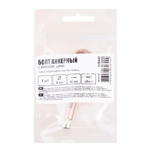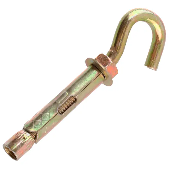 **Анкер с крюком** — это крепежное изделие, состоящее из металлической втулки, болта и конусной гайки. Установка производится путем сквозного монтажа в предварительно просверленное отверстие как в прикрепляемом материале, так и в основании. Конструкция включает три основных элемента: металлическую втулку, болт, конусную гайку. Основное назначение данного крепежного элемента: крепление стальных конструкций, установка решеток, монтаж перил, установка консолей, крепление лестниц, монтаж ворот, работы с бетоном, работы с природным камнем плотной структуры. ### Особенности: - надежное крепление обеспечивается за счет силы трения между втулкой и материалом основания; - существует возможность демонтажа анкера при необходимости; - отличается устойчивостью к коррозии за счет цинкового покрытия; - размеры: 8 x 45 мм.
