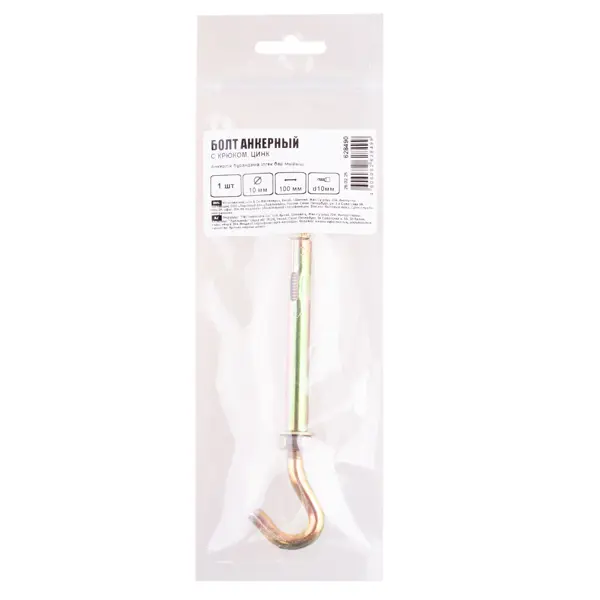 **Анкер с крюком** — это крепежное изделие, состоящее из металлической втулки, болта и конусной гайки. Установка производится путем сквозного монтажа в предварительно просверленное отверстие как в прикрепляемом материале, так и в основании. Конструкция включает три основных элемента: металлическую втулку, болт, конусную гайку. Основное назначение данного крепежного элемента: крепление стальных конструкций, установка решеток, монтаж перил, установка консолей, крепление лестниц, монтаж ворот, работы с бетоном, работы с природным камнем плотной структуры. ### Особенности: - надежное крепление обеспечивается за счет силы трения между втулкой и материалом основания; - существует возможность демонтажа анкера при необходимости; - отличается устойчивостью к коррозии за счет цинкового покрытия; - размеры: 10 x 100 мм.