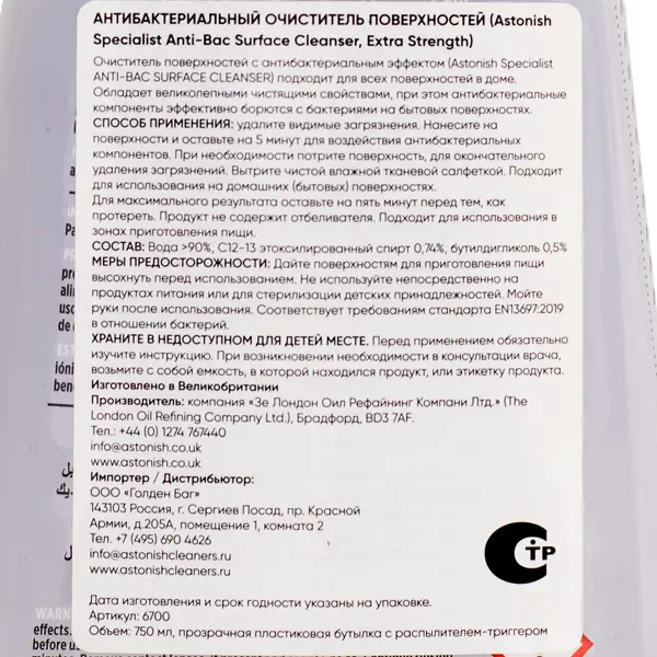 | Инструкция по применению | Удалите видимые загрязнения. Нанесите на поверхность и оставьте на 5 минут для воздействия антибактериальных компонентов. При необходимости потрите поверхность, для окончательного удаления загрязнений. Вытрите чистой влажной тканевой салфеткой. Подходит д |