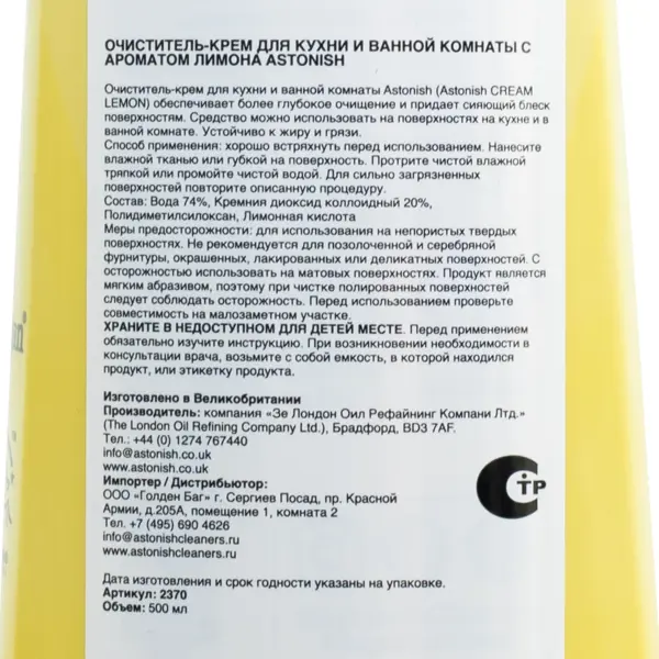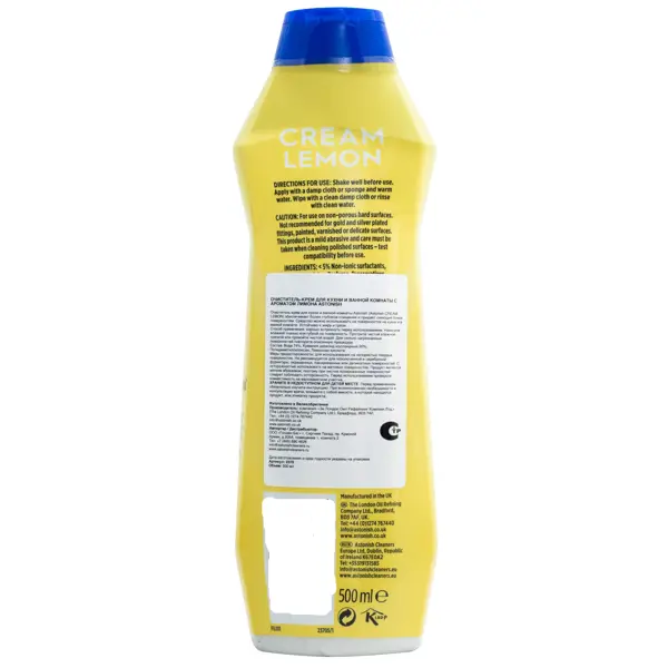 | Инструкция по применению | Хорошо встряхнуть перед использованием. Нанесите влажной тканью или губкой на поверхность. Протрите чистой влажной тряпкой или промойте водой. Для сильно загрязненных поверхностей повторите описанную процедуру. |