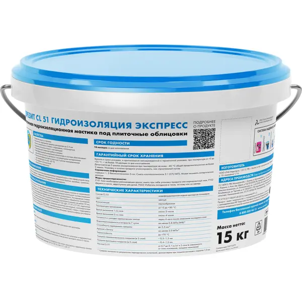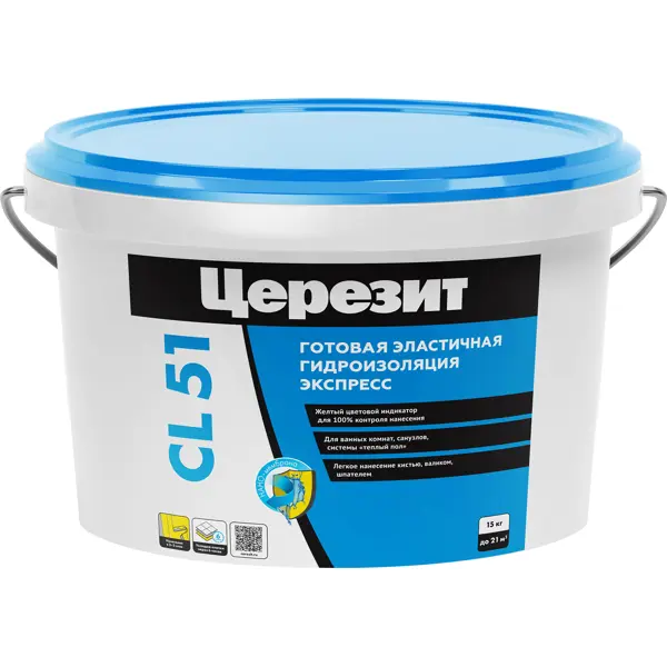 **Мастика эластичная полимерная гидроизоляционная Церезит CL51** применяется для создания водонепроницаемого слоя на поверхностях строительных конструкций, подлежащих облицовке плиткой. Состав мастики допускает периодический контакт облицованной поверхности с водой, подходит для ванных комнат, кухонь, душевых. Может использоваться только для внутренних работ. Срок годности — 12 месяцев. Страна производства — Россия. ### Преимущества - Однокомпонентный состав мастики готов к использованию сразу после вскрытия упаковки, что значительно сокращает время на производство гидроизоляционных работ. - Прочность, достаточная для последующей облицовки поверхности плиткой, достигается уже через 16 часов после нанесения мастики. - Благодаря входящим в состав компонентам, придающим эластичные свойства, мастику можно использовать даже на поверхностях, подвергающихся незначительным деформациям и температурному расширению — на теплых полах, облицованных плиткой.