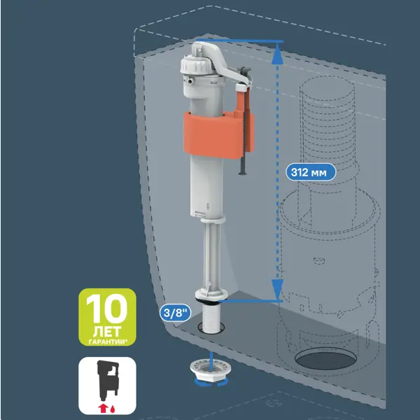 Наполнительный клапан Monlid с нижним подключением воды, с пластиковым штуцером 3/8' и возможностью регулировки уровня набора воды. Высота клапана - 312мм. Материал изготовления - прочный ABS пластик ### Комплектация: - клапан наполнительный нижнее подключение 3/8' пластиковый штуцер - комплект наклонных прокладок **БЕРЕЖНО К ЛЮДЯМ, БЕРЕЖНО К ПРИРОДЕ** - Этот товар имеет бесплатную расширенную гарантию от 3 лет. Благодаря увеличенному периоду бесплатного сервисного обслуживания вы продлеваете срок службы товара, экономите на покупке нового в случае поломки и снижаете влияние на окружающую среду.