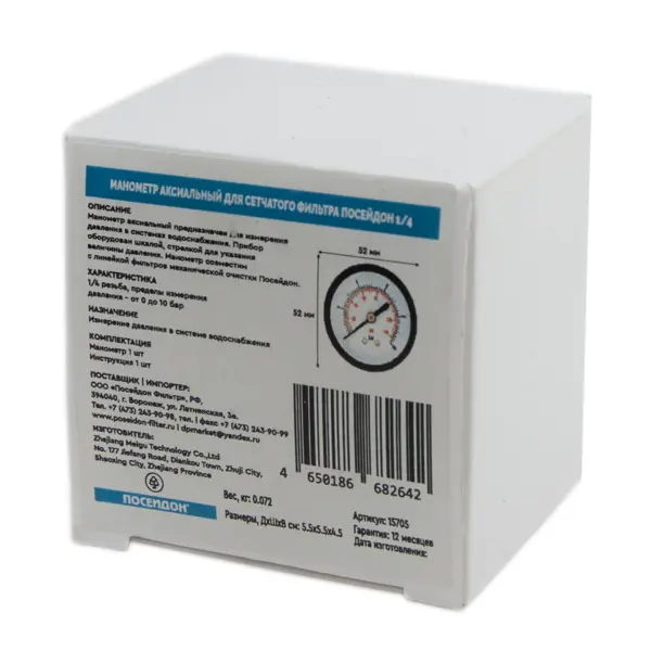 **Манометр аксиальный Посейдон** используется для измерения и визуального контроля давления в индивидуальных системах водоснабжения. Он оснащен циферблатом со шкалой до 10 бар. Преимущества манометра включают металлический корпус с нержавеющим напылением, который устойчив к механическим и атмосферным воздействиям, а также надежную конструкцию, рассчитанную на долгий срок службы. ### Особенности: - диаметр корпуса составляет 52 мм; - соединительный размер — 1/4"; - подключение — центральное.