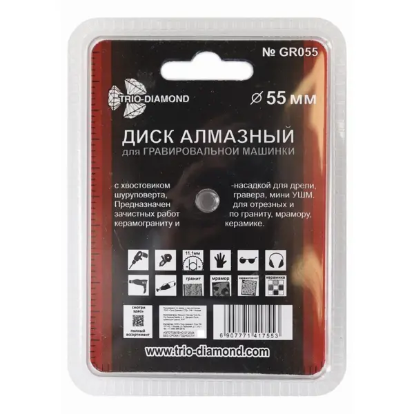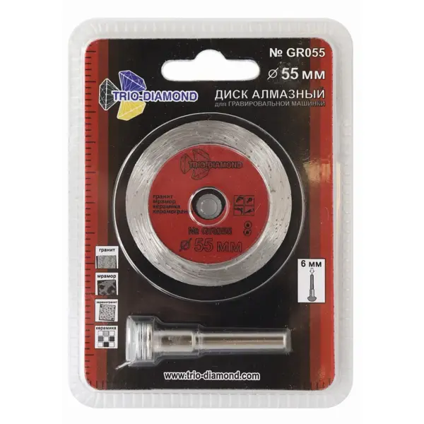 **Диск алмазный для гравера Trio-Diamond GR055** — это специализированный режущий инструмент, предназначенный для использования с гравировальными машинками. Предназначен для выполнения отрезных работ, проведения зачистных операций, работы с различными материалами: керамогранитом, керамической плиткой, фарфором, стеклом, пластиком. ### Особенности: - компактный размер позволяет работать в труднодоступных местах; - высокая точность реза обеспечивается за счет небольшого диаметра; - существует возможность выполнения как прямых, так и зачистных работ; - подходит для тонкой обработки различных материалов; - надежная фиксация обеспечивается благодаря стандартному посадочному отверстию 6 мм; - рекомендуется использовать с охлаждающей жидкостью для увеличения срока службы; - требует правильного закрепления обрабатываемого материала; - необходимо следить за равномерным износом алмазного слоя; - подходит как для профессионального, так и для бытового использования при работе с малыми объемами; -