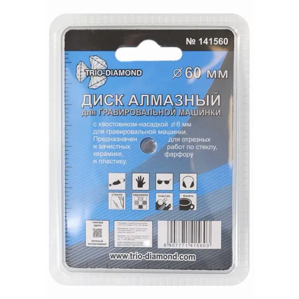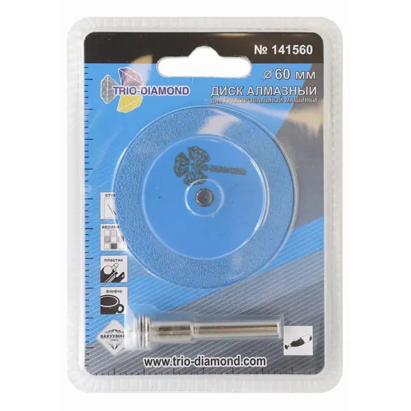**Диск алмазный для гравера Trio-Diamond 141560** — это специализированный режущий инструмент, предназначенный для использования с гравировальными машинками. Предназначен для выполнения отрезных работ, проведения зачистных операций, работы с различными материалами: керамогранитом, керамической плиткой, фарфором, стеклом, пластиком. ### Особенности: - компактный размер позволяет работать в труднодоступных местах; - высокая точность реза обеспечивается за счет небольшого диаметра; - существует возможность выполнения как прямых, так и зачистных работ; - подходит для тонкой обработки различных материалов; - надежная фиксация обеспечивается благодаря стандартному посадочному отверстию 6 мм; - рекомендуется использовать с охлаждающей жидкостью для увеличения срока службы; - требует правильного закрепления обрабатываемого материала; - необходимо следить за равномерным износом алмазного слоя; - подходит как для профессионального, так и для бытового использования при работе с малыми объемами;