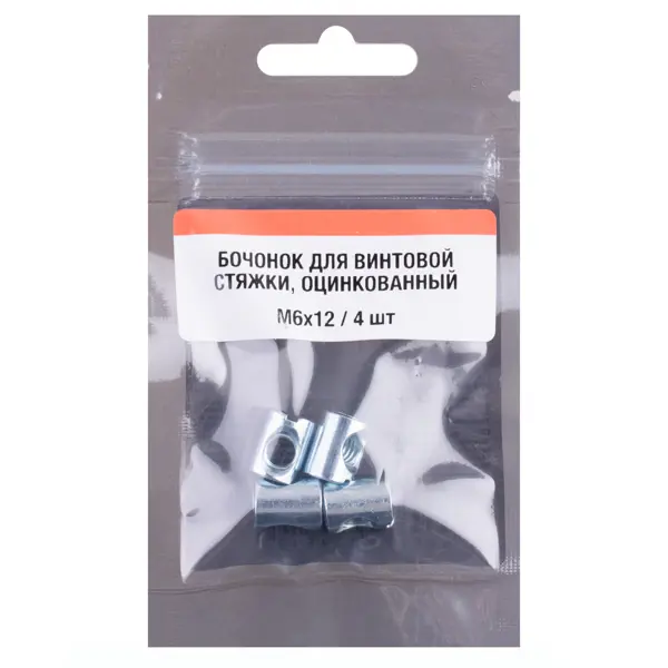 **Бочонок** — это крепежный элемент, предназначенный для использования в мебельной промышленности и при сборке корпусной мебели. Он представляет собой часть винтовой стяжки, которая обеспечивает повышенную прочность и надежность соединений. Используется для сборки различных компонентов корпусной мебели, таких как кровати, столы, стулья и шкафы, создания прочных и устойчивых соединений под углом 90 градусов. Может применяться для среднетяжелых конструкций для обеспечения их долговечности. Обеспечивает эстетичный внешний вид готового изделия благодаря незаметности крепежных элементов. ### Особенности: - размер: 10 х 12 мм, где 6 мм — диаметр резьбы, 10 мм — длина резьбы, 12 мм — общая длина бочонка; - материал изготовления — оцинкованная сталь, обеспечивающая защиту от коррозии и долговечность; - цвет — серебристый, позволяет бочонку гармонично вписываться в различные мебельные конструкции; - комплектация — 4 шт. в упаковке, что удобно для массового применения при производстве мебели; -
