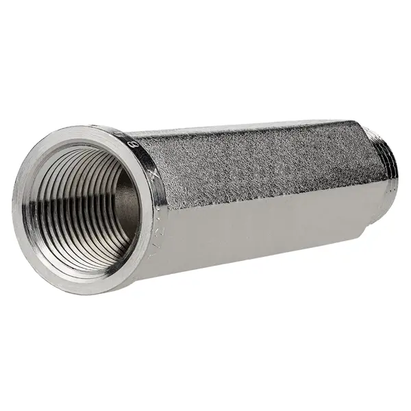 **Удлинитель шестигранный MPF** — это соединительный элемент трубопровода, который используется для удлинения соединений трубопроводов питьевого водоснабжения и инженерных коммуникаций. Удлинитель изготовлен из никелированной латуни, максимальная температура применения составляет 100 °C, номинальное давление — 6 бар. ### Особенности: - имеет наружную и внутреннюю присоединительную резьбу 1/2х80’; - оснащен гранями на корпусе для удобного монтажа.