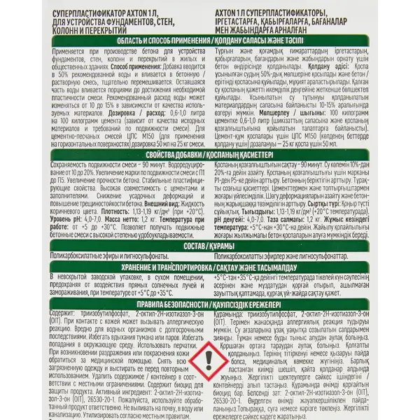 **Суперпластификатор Axton** — это специальная добавка, которую вводят в цементную или бетонную смесь с целью улучшения ее физико-химических характеристик. Используется при изготовлении товарного бетона, производства железобетонных конструкций нормального твердения, работе с бетонами высоких классов или на пористых заполнителях, изготовлении густоармированных или особо ответственных конструкций, приготовлении ремонтных растворов, возведении еврозаборов, изготовлении шлакоблоков, тротуарной плитки и мелкоштучных изделий, работы с гидротехническим или дорожным бетоном. ### Особенности: