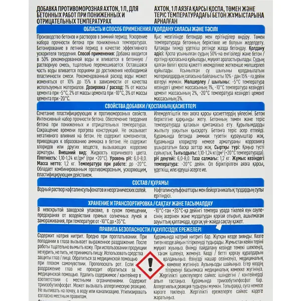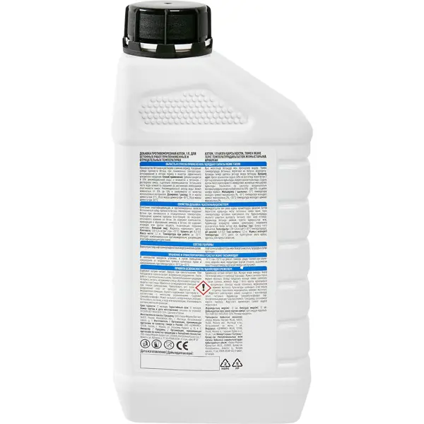 **Добавка противоморозная Axton** используется для добавления в бетонные смеси и строительные растворы, которые планируется использовать для работы при температуре до -20°С. Способствует повышению прочности конструкций, обеспечивает их устойчивость к морозу, растрескиванию и проникновению в структуру влаги. ### Особенности: - при температуре до -10°С рекомендуемая норма составляет 2 л добавки на 100 кг цементной смеси; - при температуре до -20°С — 3,5 л добавки на 100 кг цементной смеси; - упаковывается в пластиковую бутылку с герметично закручивающейся крышкой; - в упаковке находится 1 л вещества.