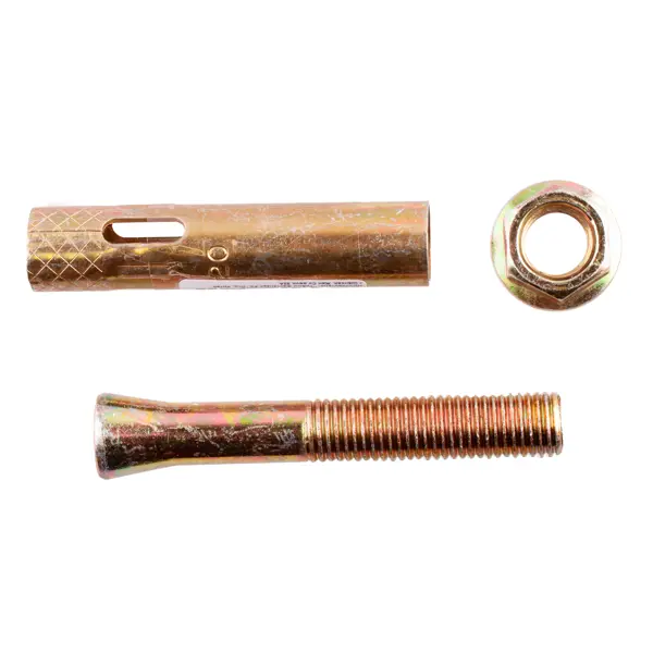**Анкер** — это крепежный элемент, предназначенный для надежного крепления строительных конструкций и оборудования в плотных материалах-основаниях. Конструкция анкерного болта включает: болт, распирающий поршень, обойму с «лепестками». Принцип работы: в несущей основе просверливается отверстие соответствующих размеров, анкер с установленной деталью вставляется в отверстие, легкими ударами молотка анкер забивается до упора, болт затягивается на 3-5 оборотов. ### Особенности: - материал изготовления — желтый цинк; - назначение — крепление в бетоне и камне; - применяется для монтажа строительных конструкций, крепления оборудования, установки ограждений, монтажа подвесных систем, крепежа в капитальных стенах и перекрытиях; - размеры: 20 x 107 мм.