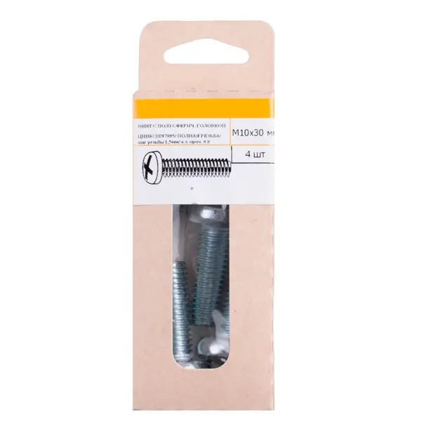 **Винт** представляет собой полнорезьбовой крепежный элемент с полукруглой головкой и внутренним шестигранным приводом. Это высокопрочное изделие, изготовленное из оцинкованной стали, соответствующее требованиям технического стандарта ISO 7380. Предназначен для создания резьбовых соединений при монтажных работах, выполнения сборочных операций, крепления элементов различных конструкций, создания соединений, требующие приложения высокого момента силы для затяжки. ### Особенности: - полнорезьбовая конструкция обеспечивает надежное соединение; - полукруглая форма головки обеспечивает оптимальное распределение нагрузки; - внутренний шестигранник позволяет создавать соединения с высоким моментом затяжки; - оцинкованное покрытие защищает от коррозии и повышает механическую прочность; - плоская опорная поверхность головки обеспечивает плотное прилегание к рабочей поверхности; - стандарт — DIN 7985; - размеры: 10 x 30 мм; - в упаковке находится 4 шт.