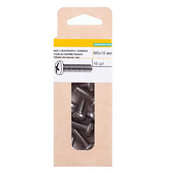 **Винт** представляет собой полнорезьбовой крепежный элемент с полукруглой головкой и внутренним шестигранным приводом. Это высокопрочное изделие, изготовленное из оцинкованной стали, соответствующее требованиям технического стандарта ISO 7380. Предназначен для создания резьбовых соединений при монтажных работах, выполнения сборочных операций, крепления элементов различных конструкций, создания соединений, требующие приложения высокого момента силы для затяжки. ### Особенности: - полнорезьбовая конструкция обеспечивает надежное соединение; - полукруглая форма головки обеспечивает оптимальное распределение нагрузки; - внутренний шестигранник позволяет создавать соединения с высоким моментом затяжки; - оцинкованное покрытие защищает от коррозии и повышает механическую прочность; - плоская опорная поверхность головки обеспечивает плотное прилегание к рабочей поверхности; - стандарт — DIN 7985; - размеры: 6 x 16 мм; - в упаковке находится 16 шт.