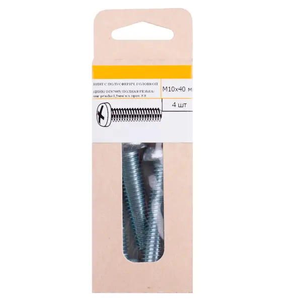 **Винт** представляет собой полнорезьбовой крепежный элемент с полукруглой головкой и внутренним шестигранным приводом. Это высокопрочное изделие, изготовленное из оцинкованной стали, соответствующее требованиям технического стандарта ISO 7380. Предназначен для создания резьбовых соединений при монтажных работах, выполнения сборочных операций, крепления элементов различных конструкций, создания соединений, требующие приложения высокого момента силы для затяжки. ### Особенности: - полнорезьбовая конструкция обеспечивает надежное соединение; - полукруглая форма головки обеспечивает оптимальное распределение нагрузки; - внутренний шестигранник позволяет создавать соединения с высоким моментом затяжки; - оцинкованное покрытие защищает от коррозии и повышает механическую прочность; - плоская опорная поверхность головки обеспечивает плотное прилегание к рабочей поверхности; - стандарт — DIN 7985; - размеры: 10 x 40 мм; - в упаковке находится 4 шт.