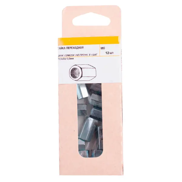**Гайка переходная М6 DIN 6334** — это удлиненный шестигранный крепежный элемент с внутренней метрической резьбой, предназначенный для соединения и удлинения резьбовых шпилек, болтов и стержней. ### Особенности: - шестигранная форма предназначена для удобного монтажа; - удлиненная конструкция рассчитана на надежное соединение элементов; - двойная резьба подходит для переходных соединений; - цинковое покрытие защищает от коррозии; - в упаковке идут 12 гайки; - подходит для использования в условиях умеренной влажности.
