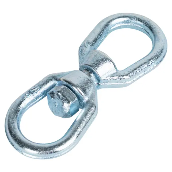 **Вертлюг** — это специальное такелажное приспособление, предназначенное для соединения двух отдельных элементов такелажа. Конструкция представляет собой сборочную единицу с петлями на обоих концах, позволяющую элементам свободно вращаться относительно друг друга. Основное предназначение — предотвращение скручивания цепей, канатов и тросов при подъеме и перемещении грузов. Применяется в строительных работах, промышленном производстве, бытовых такелажных операциях, при подъеме и транспортировке грузов. ### Особенности: - диаметр — 8 мм; - материал изготовления — оцинкованная сталь; - тип соединения: петля-петля; - устраняет вероятность закручивания тросов и цепей; - предотвращает передачу вращения между элементами; - защищает от образования петель; - снижает внутреннее напряжение в тросе или цепи; - увеличивает срок службы такелажного оборудования; - в комплекте идут 2 шт.