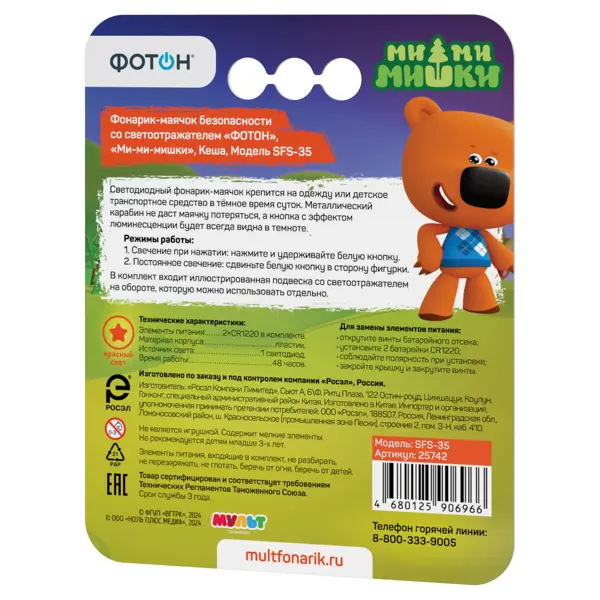 **Фонарь-маячок Фотон Ми-ми-мишка Кеша** — это детский светодиодный фонарик, предназначенный для обеспечения безопасности ребенка в темное время суток. Он крепится на одежду или детское транспортное средство и служит как маячок, который помогает сделать ребенка более заметным и безопасным на улице. Этот фонарик-маячок используется для повышения видимости ребенка в темное время суток, что особенно важно для безопасности при прогулках, поездках на велосипеде или самокате. Он привлекает внимание и помогает предотвратить возможные несчастные случаи. ### Особенности: - корпус фонаря выполнен из прочного пластика, что обеспечивает легкость и долговечность; - компактные размеры позволяют легко крепить его на одежду или детское транспортное средство; - оснащен одним светодиодом, обеспечивающим рассеянный свет; - световой поток составляет 20 Лм, что достаточно для создания заметного светового сигнала; - режимы работы: свет при нажатии — нужно просто нажать и удерживать белую кнопку, постоянное