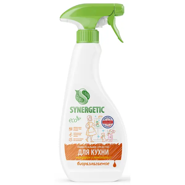 **Универсальное чистящее средство для кухни Synergetic Мандарин и лемонграсс» позволит в считаные минуты навести порядок на кухне. Оно подходит для раковин, моек, столешницы и плит (включая стеклокерамические) и противней, а также для бытовой техники: холодильника, микроволновой печи и пр. А за счет того, что спрей не содержит хлора, фосфатов, агрессивных ПАВ, его можно применять в зонах приготовления пищи. Распылите средство на очищаемую поверхность и оставьте на несколько секунд, затем смойте водой и насухо протрите. При необходимости и для более въевшихся загрязнений средство можно подержать на поверхности от 3 до 5 минут. Перед применением проверить совместимость спрея с обрабатываемой поверхностью на небольшом малозаметном участке. Благодаря биоразлагаемым компонентам в составе средство не вредит септикам. После нанесения оставляет ненавязчивый цитрусовый аромат. Спрей экономично расходуется, поэтому его хватит на длительное время. ### Особенности: - биоразлагаемый состав; - объ