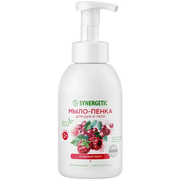 **Мыло-пенка для рук Synergetic гипоаллергенная Ягодный мусс** деликатно очищает кожу рук, не вызывая раздражения. Подходит для людей с чувствительной кожей и детей с первых дней жизни. После нанесения оставляет едва уловимый ягодный аромат. Экстракт клюквы тонизирует и успокаивает чувствительную кожу, делая ее упругой и эластичной, экстракт косточек малины смягчает, а бисаболол успокаивает кожу. Гипоаллергенное мыло с уровнем pH 5,5 безопасно даже при частом использовании. Оно не содержит парабенов, минеральных масел, силикона и красителей. За счет нежной и воздушной текстуры пенки мыло экономично расходуется. Его также можно использовать как гель для душа. Средство не тестируется на животных. ### Особенности: - объем: 500 мл;
