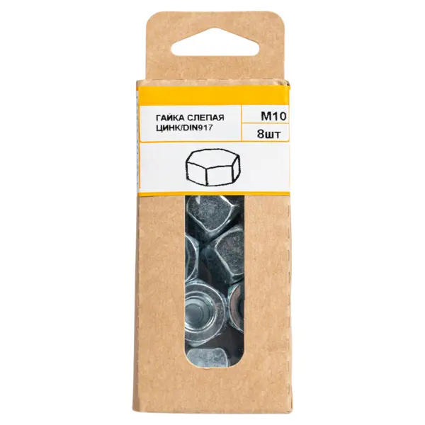 **Гайка слепая DIN 917** — это специализированный крепежный элемент, который используется для создания надежных соединений в различных областях. Она представляет собой шестигранный колпачок с глухим торцом, что делает ее идеальной для ситуаций, где не требуется сквозное отверстие. ### Особенности: - диаметр резьбы — М10; - материал изготовления — оцинкованная сталь; - оцинкованное покрытие защищает от коррозии и увеличивает срок службы; - отсутствие сквозного отверстия предотвращает самопроизвольное раскручивание; - высокая прочность и надежность соединения обеспечивает устойчивость к нагрузкам; - хорошо переносит перепады температур; - сохраняет свои свойства при вибрационных нагрузках; - подходит для различных видов работ благодаря своей конструкции.