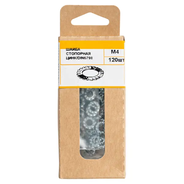 **Шайба зубчатая** — это специализированный крепежный элемент, изготовленный из нержавеющей стали, который используется для предотвращения самопроизвольного раскручивания резьбовых соединений. Благодаря наличию зубцов, такие шайбы обеспечивают надежное фиксирование и повышенную устойчивость к внешним воздействиям. ### Особенности: - М4 — стандартный размер, подходящий для болтов и гаек с резьбой М4; - материал изготовления — нержавеющая сталь, устойчивая к коррозии и воздействию окружающей среды; - форма — зубчатая (форма А — наружные зубья); - соответствует международным стандартам DIN 6798 и ГОСТ 10463-81; - количество в упаковке — 120 шт.