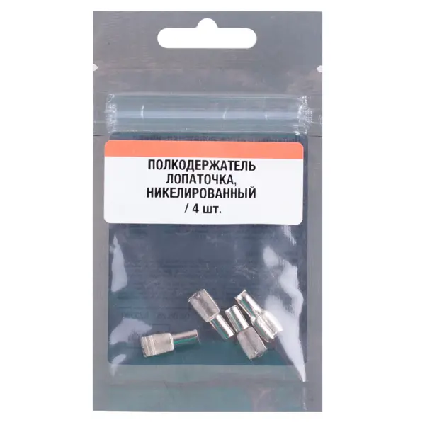 **Полкодержатель лопаточка** — это специализированная мебельная фурнитура, предназначенная для надежного крепления полок в корпусной мебели. Эта деталь крепежной системы обеспечивает устойчивость и надежность фиксации полок, что делает ее незаменимой при создании различных мебельных конструкций. ### Особенности: - размеры: диаметр монтажного отверстия — 5 мм, длина крепежного элемента — 19 мм; - изготовлены из прочного металла, что обеспечивает долговечность и устойчивость к нагрузкам; - никелированное покрытие придает изделию серебристый цвет и защищает от коррозии; - в упаковке 4 полкодержателей, что достаточно для оснащения нескольких полок; - легкая и быстрая установка без необходимости использования специальных инструментов; - имеет высокую прочность и устойчивость к механическим нагрузкам; - подходят для использования в различных типах мебели: шкафы, гардеробные, полки в тумбах.
