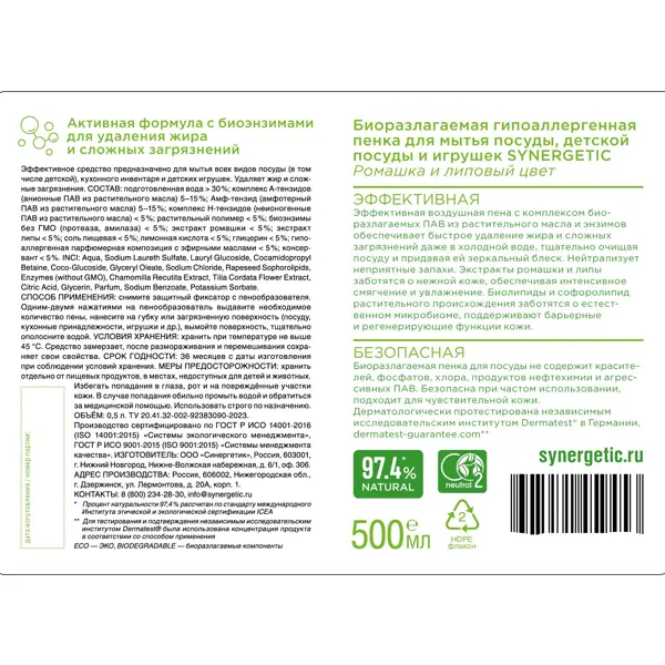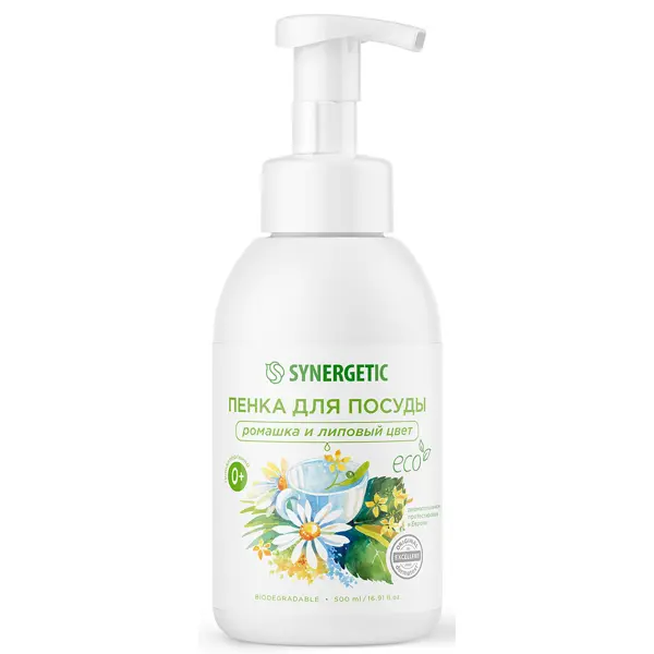 **Пенка для посуды Synergetic гипоаллергенная Ромашка** - гипоаллергенное средство, которое обеспечит быстрое удаление жира и сложных загрязнений даже в холодной воде, тщательно очищая посуду и придавая ей зеркальный блеск. Пенка также нейтрализует неприятные запахи. Экстракты ромашки и липы позаботятся о коже, смягчая и увлажняя ее. Биолипиды и софоролипид растительного происхождения - о естественном микробиоме, поддержат барьерные и регенерирующие функции кожи. Средство для посуды не содержит красителей, фосфатов, хлора, продуктов нефтехимии и агрессивных ПАВ. Снимите защитный фиксатор с пенообразователя. Одним-двумя нажатиями на пенообразователь выдавите необходимое количество пены, нанесите на губку или загрязненную поверхность (посуду, кухонные принадлежности, игрушки и др.), вымойте поверхность, тщательно ополосните водой. Хранить средство следует при температуре не выше 45°С. При низких температурах пенка замерзает, но после размораживания и перемешивания сохраняет свои свойств
