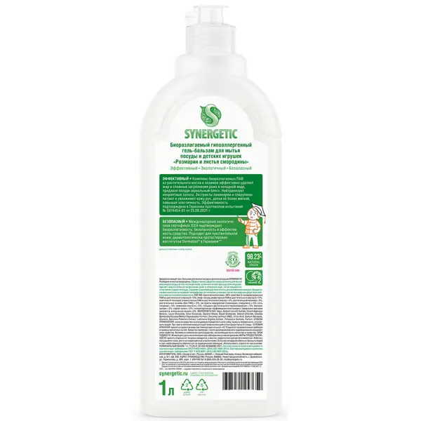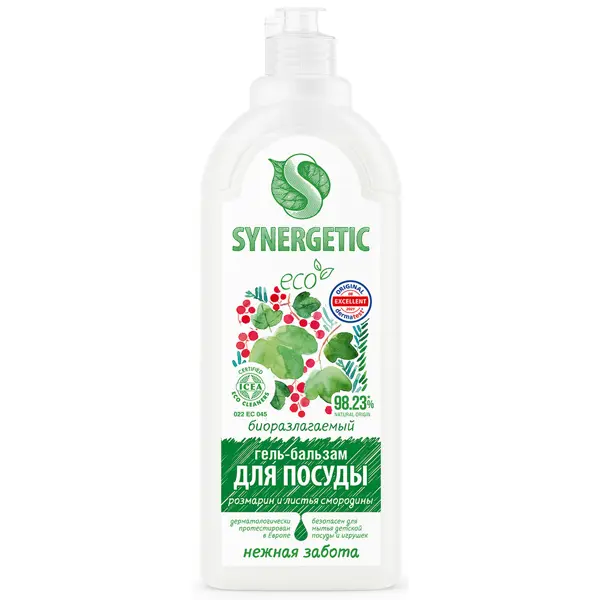 **Биоразлагаемый гель-бальзам для мытья посуды Synergetic Розмарин и листья смородины** предназначен для мытья всех видов посуды (в том числе детской), кухонного инвентаря и детских игрушек. Удаляет жир и сложные загрязнения даже в холодной воде, легко смывается, не оставляет следов на посуде. Экстракты ламинарии и спирулины питают и увлажняют кожу рук делая её более мягкой и повышая эластичность. Биоразлагаемый гипоаллергенный гель-бальзам подходит для чувствительной кожи. Он также безопасен для септических установок. После применения средства остается приятный аромат. Перед распылением проверьте совместимость средства с обрабатываемой поверхностью на небольшом незаметном участке. ### Особенности: - эффективно удаляет жир и сложные загрязнения даже в холодной воде; - легко смывается; - не оставляет следов на посуде; - гипоаллергенный; - безопасен для мытья детской посуды и игрушек; - не вредит септическим установкам; - подходит для таких материалов, как: керамика, стеклокерамика, пла