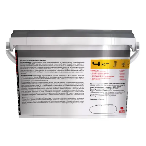 **Жидкие гвозди Rocks Pro** — универсальный строительный клей на силикатной основе, предназначенный для надежного крепления различных материалов. Это надежное решение для строительных и ремонтных работ, позволяющее обеспечить прочное и долговечное соединение различных материалов. Благодаря своей универсальности и высокой адгезии, жидкие гвозди подходят для широкого спектра задач как в бытовых, так и в профессиональных условиях. Применяются для ремонтных работ в любых помещениях, монтажа деревянных элементов, установки плитки и керамики, крепления различных материалов на стены и потолки, строительных и отделочных работ. Обеспечивают высокую адгезию с разными поверхностями: деревом, МДФ, обивкой мебели, пробкой, керамикой, плиткой. ### Особенности: - вес — 4 кг; - цвет после высыхания — бежевый; - может использоваться на горизонтальных и вертикальных поверхностях; - перед работой нужно очистить поверхность от любых загрязнений, затем нанести клей равномерным слоем, прижать поверхности