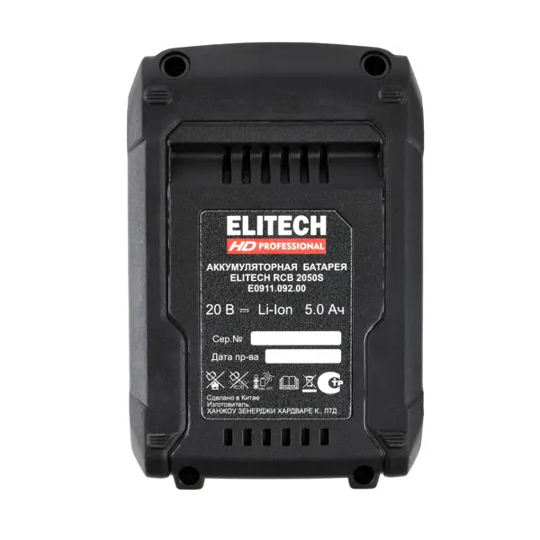 **Аккумулятор Elitech RCB 2050S EHD** - это литий-ионный (Li-Ion) источник питания для аккумуляторного инструмента серии HD Professional. Является частью универсальной платформы ELP (Elitech Lithium Platform). Предназначен для обеспечения автономной работы электроинструмента, замены традиционных сетевых инструментов, работы в местах без доступа к электричеству, использования в составе профессионального инструмента. ### Особенности: - напряжение батареи - 20 В, емкость - 5.0 А*ч; - конструкция - универсальный слайдер; - присутствует индикатор заряда; - оснащен системой контроля параметров батареи; - имеет встроенное принудительное охлаждение; - обеспечивает сниженное тепловое воздействие на элементы; - отличается высокой надежностью в экстремальных условиях и устойчивостью к перепадам температуры; - защищен от пыли, влаги и перегрузок; - совместим с инструментами серии HD Professional, включая дрели и шуруповерты, перфораторы, болгарки, реноваторы, цепные пилы.