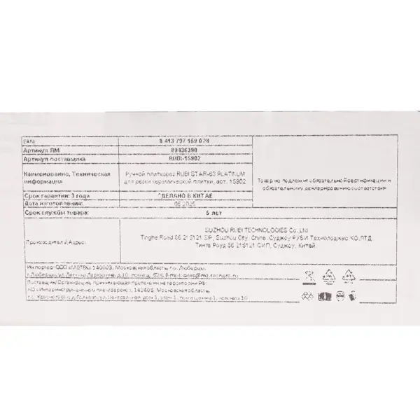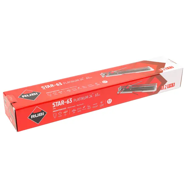 **Ручной плиткорез RUBI STAR-63 PLATINUM** предназначен для точной резки любого типа керамической плитки (кафеля, керамогранита и других видов). ### Преимущества: - Основание плиткореза из экструдированного алюминия обеспечивает высокую устойчивость и поддержку, обеспечивая чистый и аккуратный рез; - Плиткорез оснащается двумя складными боковыми упорами, которые в разложенном состоянии обеспечивают дополнительную устойчивость инструменту на любом основании; - Усиленные направляющие из хромированной стали с антикоррозийной обработкой обеспечивают плавное движение резца и точность при работе в сложных условиях эксплуатации; - Встроенный миллиметровый боковой упор позволяет осуществлять резку под углом (от 0 до 45º) быстро и серийно; - Основание плиткореза оснащёно мягкой амортизирующей накладкой из вспененного синтетического материала, которая предотвращает нежелательные перемещения плитки во время работы. **БЕРЕЖНО К ЛЮДЯМ, БЕРЕЖНО К ПРИРОДЕ** - Этот товар имеет бесплатную расширенн