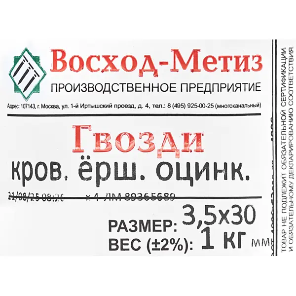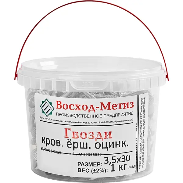 **Гвозди ершеные** — это крепежные элементы. Предназначены для крепления гибкой черепицы и других кровельных материалов, использования в наружных работах, особенно при монтаже скатной кровли. Обеспечивают надежное крепление и влагостойкость кровельного покрытия. ### Особенности: - размеры: диаметр гвоздя — 3,5 мм, длина — 30 мм; - оцинкованная сталь обеспечивает защиту от коррозии и долговечность; - в конструкцию входят: ножка с кольцевым (ершеным) профилем, который облегчает забивание гвоздя и обеспечивает надежное закрытие отверстия широкой шляпкой; - благодаря особой конструкции и материалу, гвозди обеспечивают прочное сцепление с деревянной поверхностью; - широкая шляпка предотвращает попадание влаги и осадков под кровельное покрытие; - ершеный профиль позволяет легко забивать гвозди без риска повреждения материала; - в упаковке находится 1 кг.