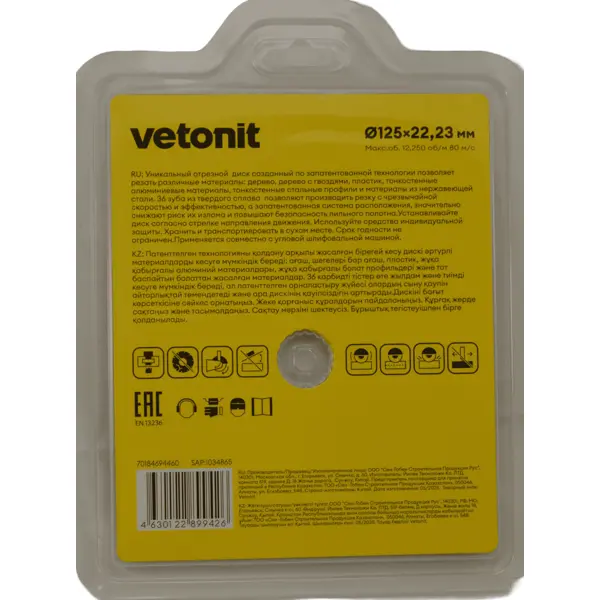 **Диск отрезной Vetonit тип 41** — это специализированный абразивный диск, предназначенный для резки различных материалов, таких как сталь и нержавеющая сталь. Этот диск отличается высоким качеством и эффективностью благодаря оптимальному сочетанию связки и типа зерна, что обеспечивает тонкий и четкий рез. ### Особенности: - основное назначение: резка труб из стали и нержавеющей стали, обработка листового железа и стальных листов, распил изделий из минеральных материалов и пластика, выполнение точных и чистых резов; - благодаря оптимальной толщине в 1,3 мм и специальной связке обеспечивается тонкий и четкий рез; - подходит для резки различных материалов, включая нержавеющую сталь; - подходит для большинства углошлифовальных машин (болгарок) с соответствующим посадочным диаметром; - размеры: 125 х 22,2 мм.