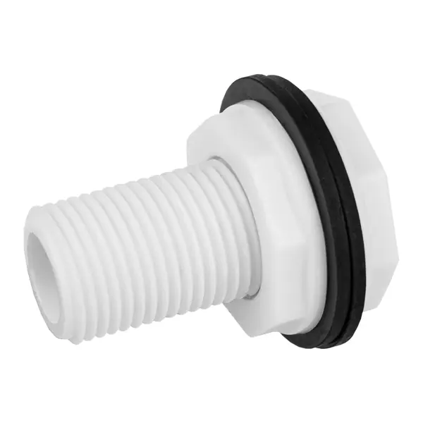 **Штуцер** - это специализированное сантехническое изделие для подключения водопроводных труб к различным емкостям, таким как бочки или баки. Применяется для организации системы водоснабжения, подключения различных емкостей к водопроводной сети или создания системы полива. С помощью этого штуцера можно подсоединить к емкости кран, шланг или другие элементы трубопроводной системы. Особенно актуально использование такого штуцера при организации дачного водоснабжения, систем полива, монтаже резервуаров для хранения воды и других подобных задач, где требуется надежное и герметичное подключение к емкости. ### Особенности: - конструкция включает в себя сам штуцер, две уплотнительные прокладки для герметизации и прижимную гайку; - изделие изготовлено из пластика, что обеспечивает высокую коррозионную стойкость и длительный срок службы; - имеет наружную резьбу 1/2 дюйма; - способен выдерживать рабочее давление до 16 бар и температуру до 100º; - монтаж осуществляется путем врезки в стенку бака