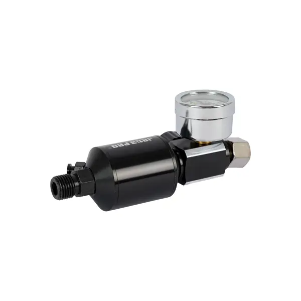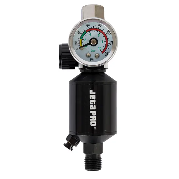 **Редуктор давления Jeta Pro JFR10** представляет собой комплексное устройство для подготовки сжатого воздуха, включающее в себя функции регулировки давления, фильтрации и контроля. Прибор оснащен встроенным манометром для визуального контроля давления в системе. Предназначен для очистки сжатого воздуха от влаги и механических примесей, а также установки и поддержания необходимого давления в пневмосистеме. Устройство устанавливается на входе пневмоинструмента и обеспечивает его надежную работу. ### Особенности: - фильтрующий элемент имеет степень очистки 5 микрон, что позволяет эффективно задерживать крупные частицы загрязнений; - рабочее давление - до 10 бар; - оснащен соединениями с наружной и внутренней резьбой 1/4 дюйма; - имеет специальный клапан для слива конденсата, который активируется вручную; - встроенный манометр предусмотрен для точного контроля давления; - подходит для использования с различными пневмоинструментами, включая краскопульты; - конусное соединение обеспечивает