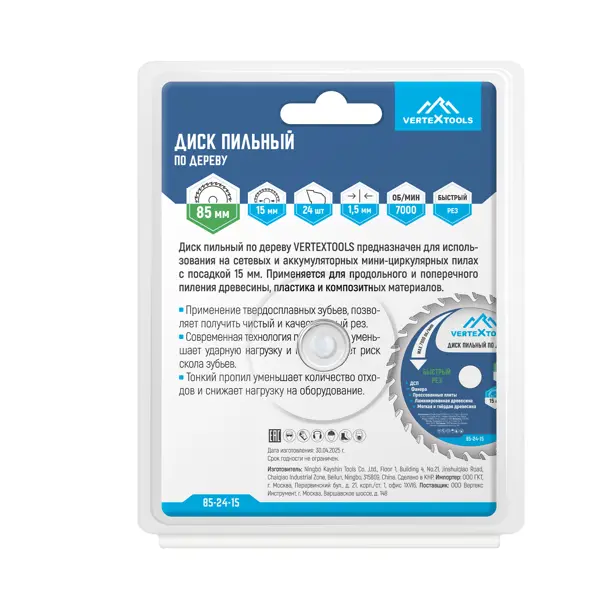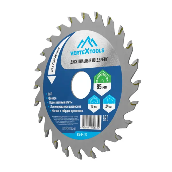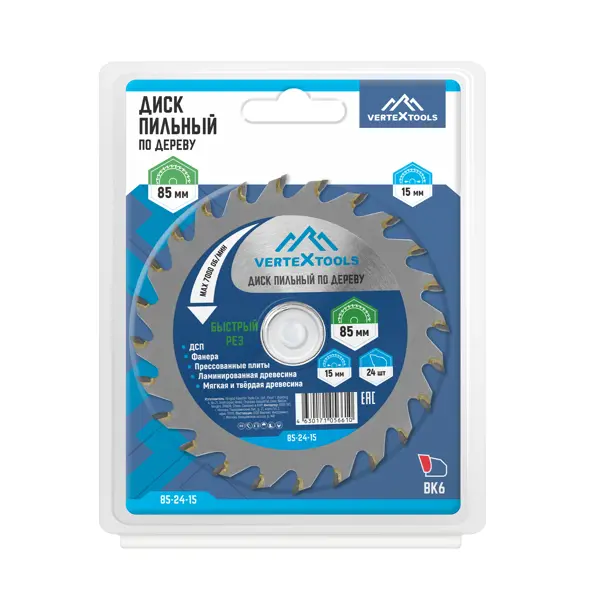 **Диск пильный по дереву Vertextools 85-24-15 24Т** - это режущий инструмент для обработки древесины и пластика. Подходит для выполнения как прямых, так и фигурных пропилов. Благодаря компактным размерам особенно эффективен при работе в труднодоступных местах и с небольшими заготовками. ### Особенности: - оснащенный 24 зубьями и имеет диаметр 85 мм с посадочным отверстием 15 мм; - толщина диска составляет 1 мм; - предназначен для использования с циркулярными пилами; - максимальная скорость вращения составляет 7000 об/мин; - обеспечивает качественный и точный рез при работе с различными древесными материалами, включая фанеру, ДСП и другие древесные плиты.